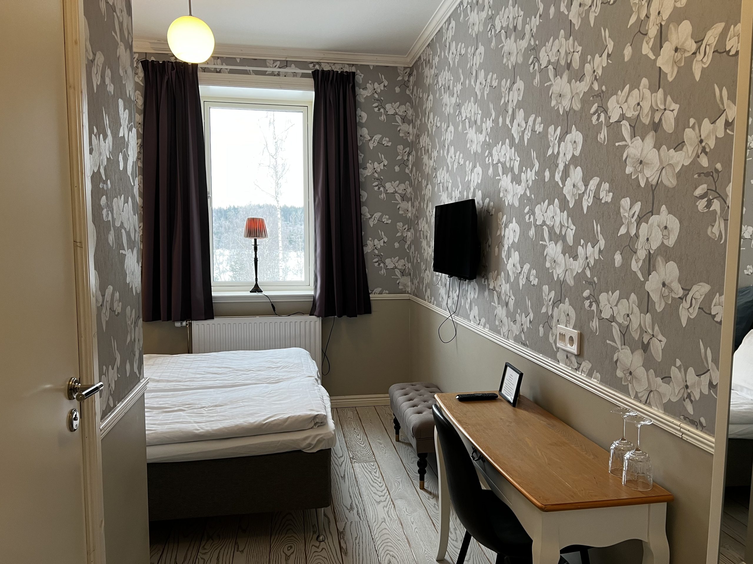 Det är ett vackert och ljust rum är beläget på entréplan, och du vaknar till en härlig utsikt över golfbanan. Här finns plats för två personer och hundar är välkomna. Inredningen andas lantlig romantik och i rummet finns bekväma sittmöbler, skrivbord och inte minst härliga hotellsängar att sova gott och länge i. Badrummet är helkaklat med dusch och toalett, och det finns både hårtork och generöst utrymme för personliga saker. Strykjärn finns för utlåning i receptionen. Gratis wifi finns tillgängligt i ditt rum och i alla våra övriga lokaler. Hotellstandarden är tre stjärnor med ett plus i kanten. Boka rummet direkt med hjälp av formuläret till höger! Frukostbuffé ingår.